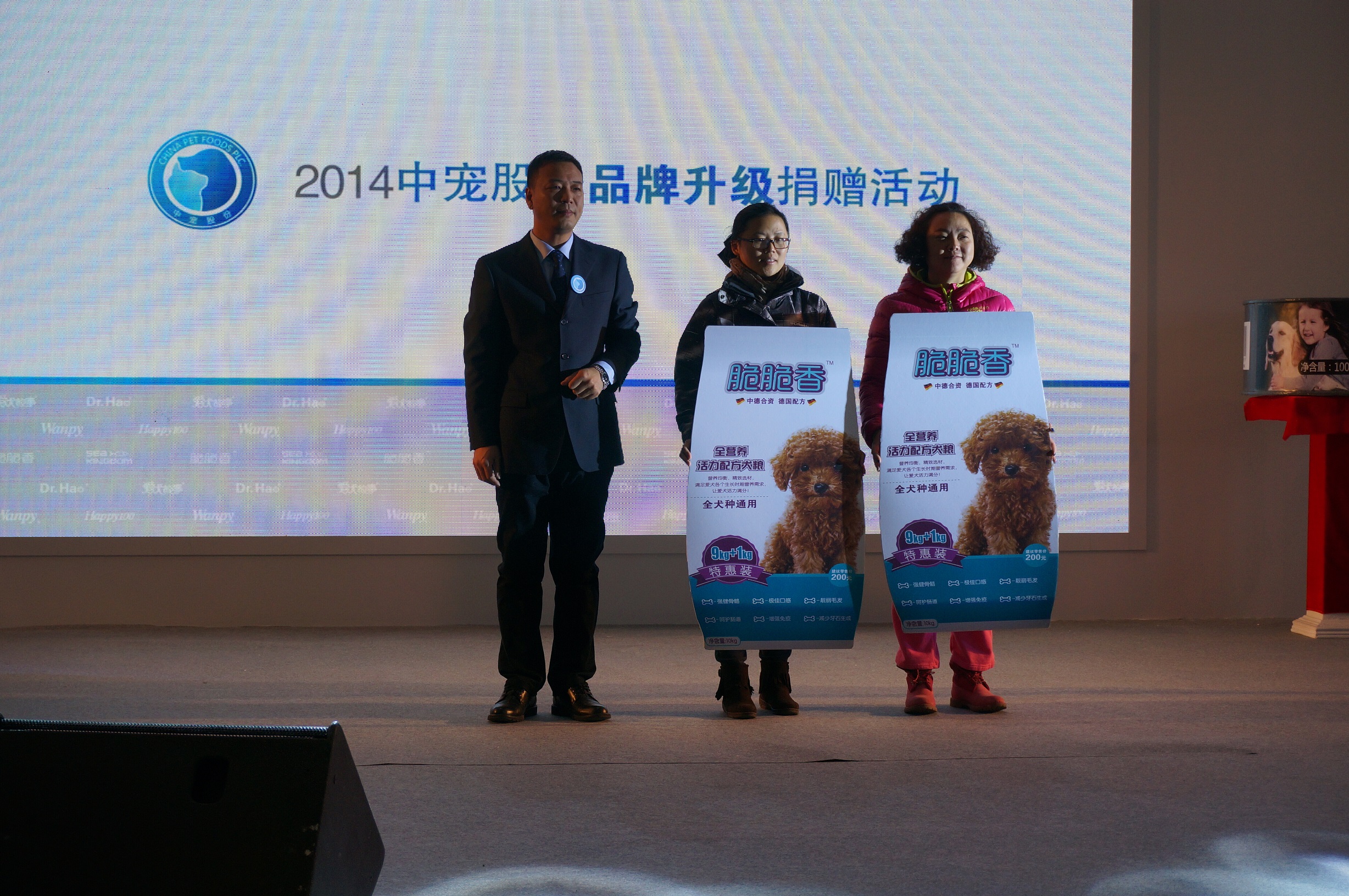 會議現場,中寵股份副總裁梁洪文先生代表公司向北京好貓好狗伴侶動物基地和幸運土貓兩個寵物救助組織進行愛心寵物糧食捐贈。